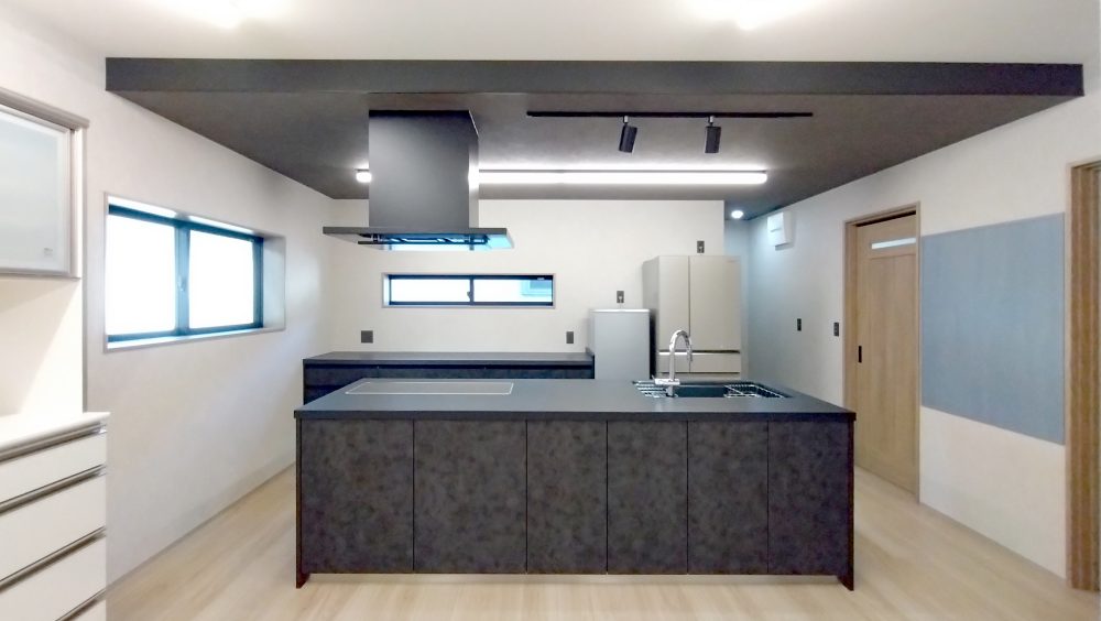 キッチンはパナソニックキッチンLクラス・ヴィンテージメタル柄。アイランドキッチンでフラットなカウンターにすることで、スッキリと空間が広く見えます。キッチンの色に合わせて下がり天井の色をコーディネートし、オープンなLDK空間の中でも、キッチンの領域を柔らかく仕切っています。キッチンの傍らには、ブルーグレー色のPanasonicマグネットボードを設置しました。市販のマグネットフックを取り付けたり、写真を飾ったりすることができます。キッチンから洗濯脱衣室へ直接行けるようにして、家事動線に配慮したプランにしました。