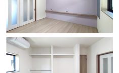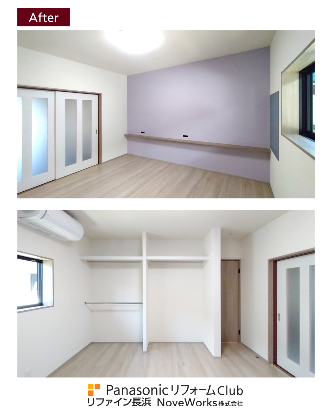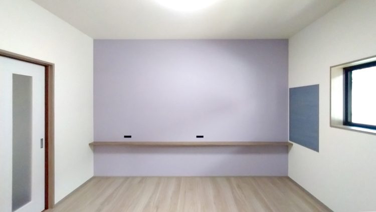 - リビングから直接アクセスできる寝室をプランしました。寝室のベッドを配置する面は、奥様お好みの上品な藤色の壁紙で設え、枕元には造作カウンターとコンセント、マグネットボードを造りつけました。枕元のコンセントの内の1ヵ所は照明のスイッチになっていますので、ベッドに横たわった状態で照明を入り切りすることができます。