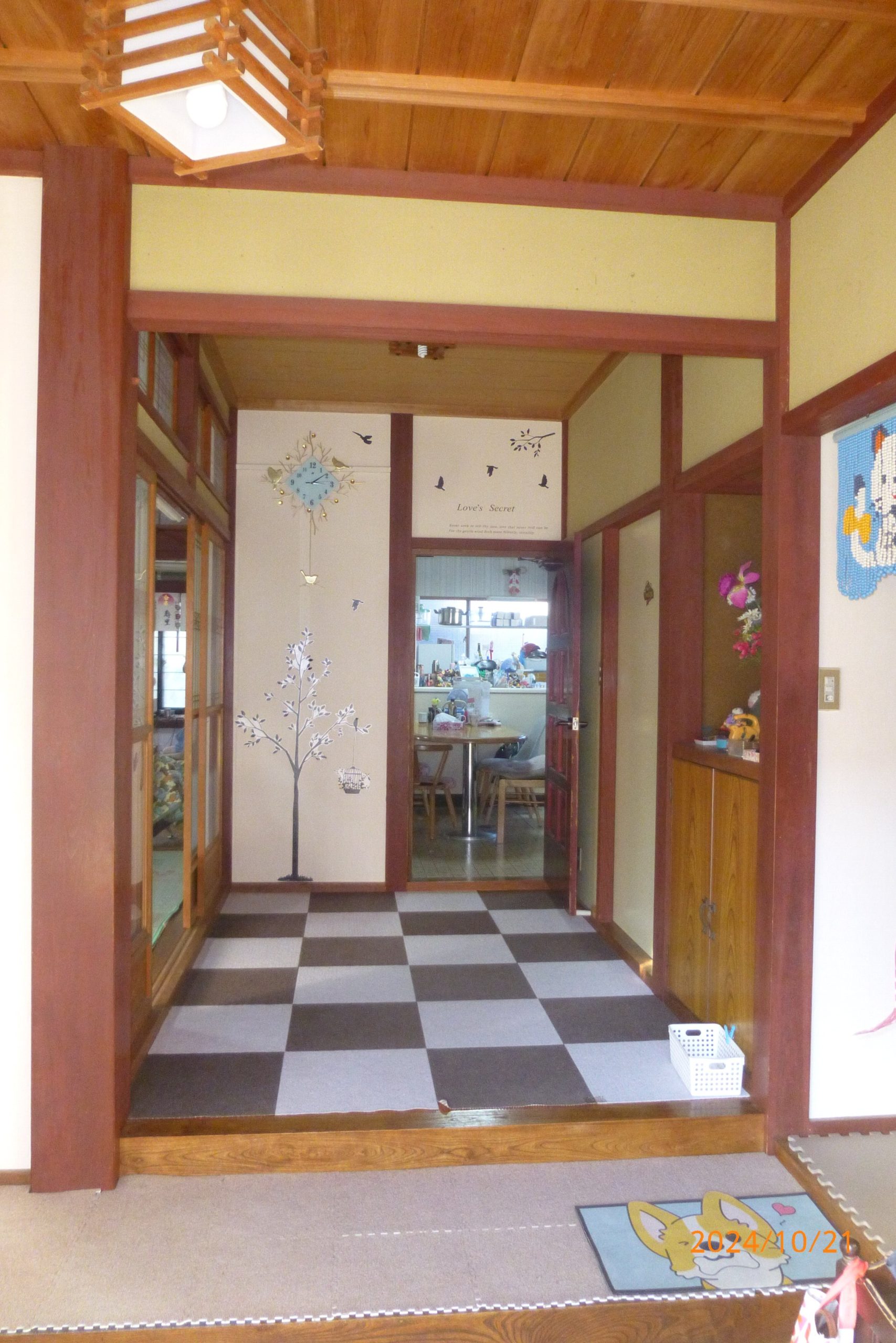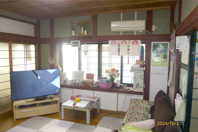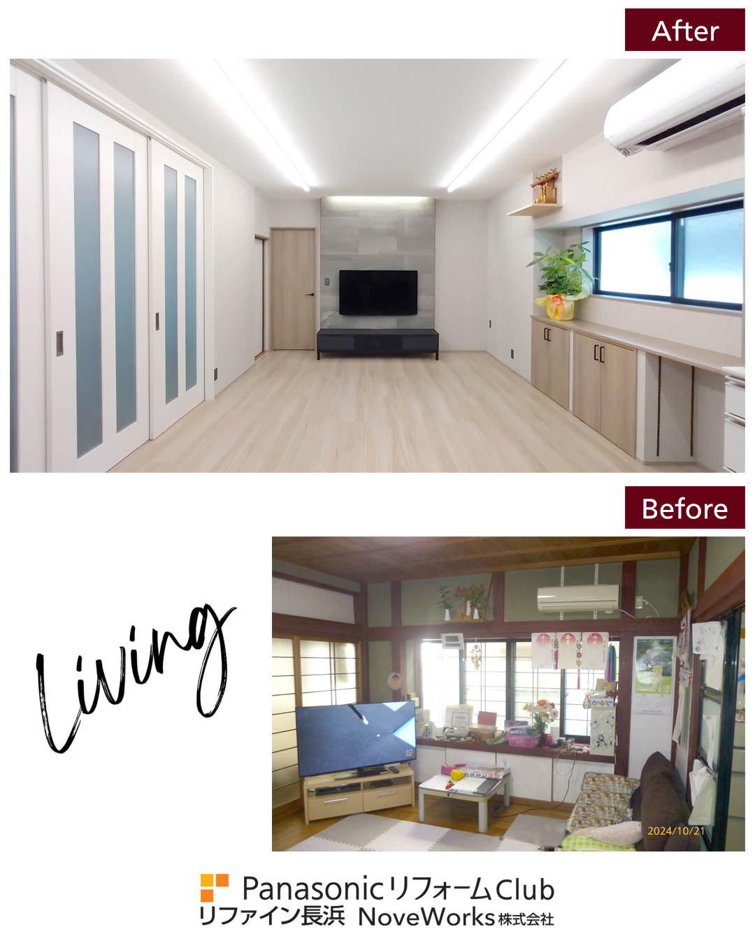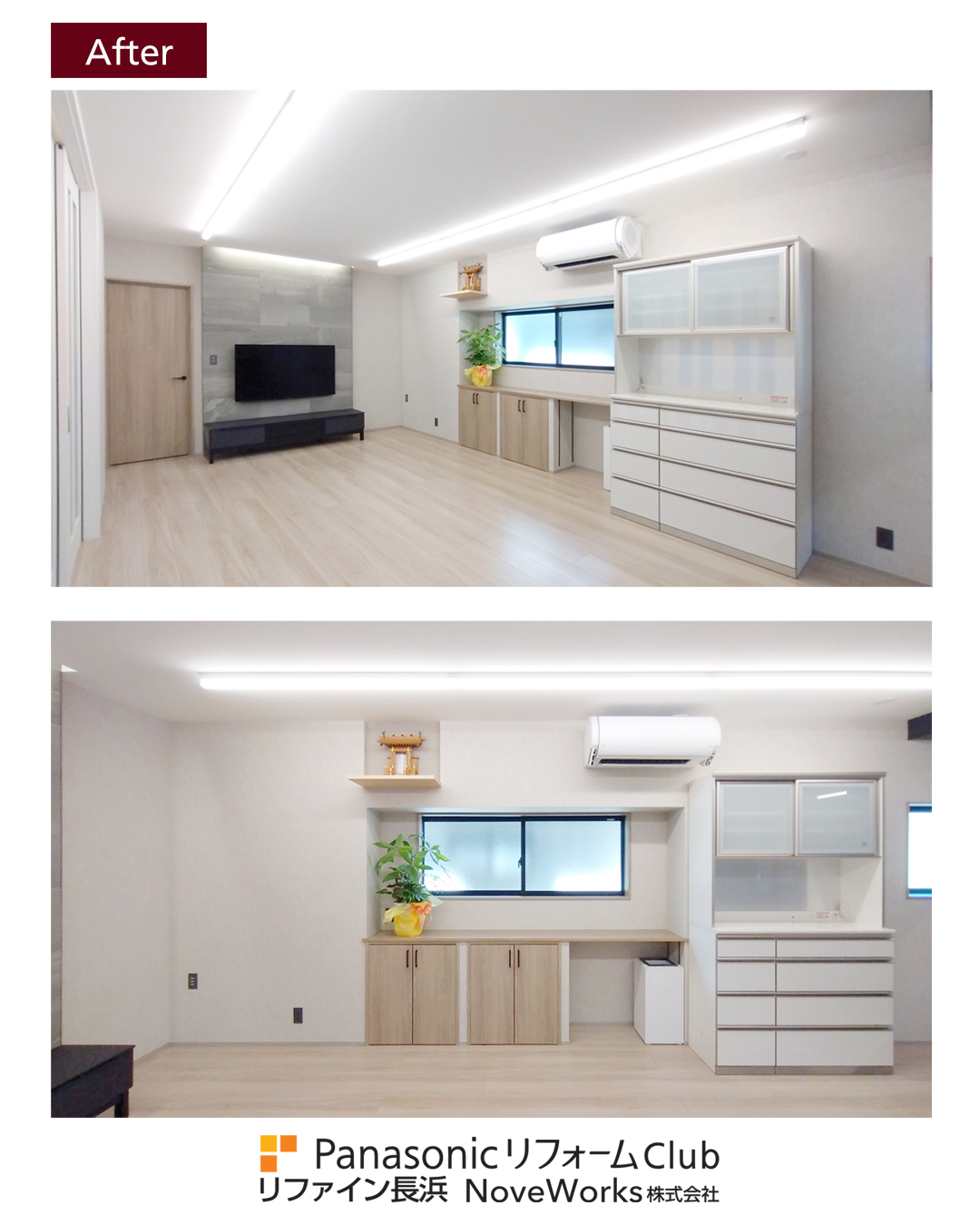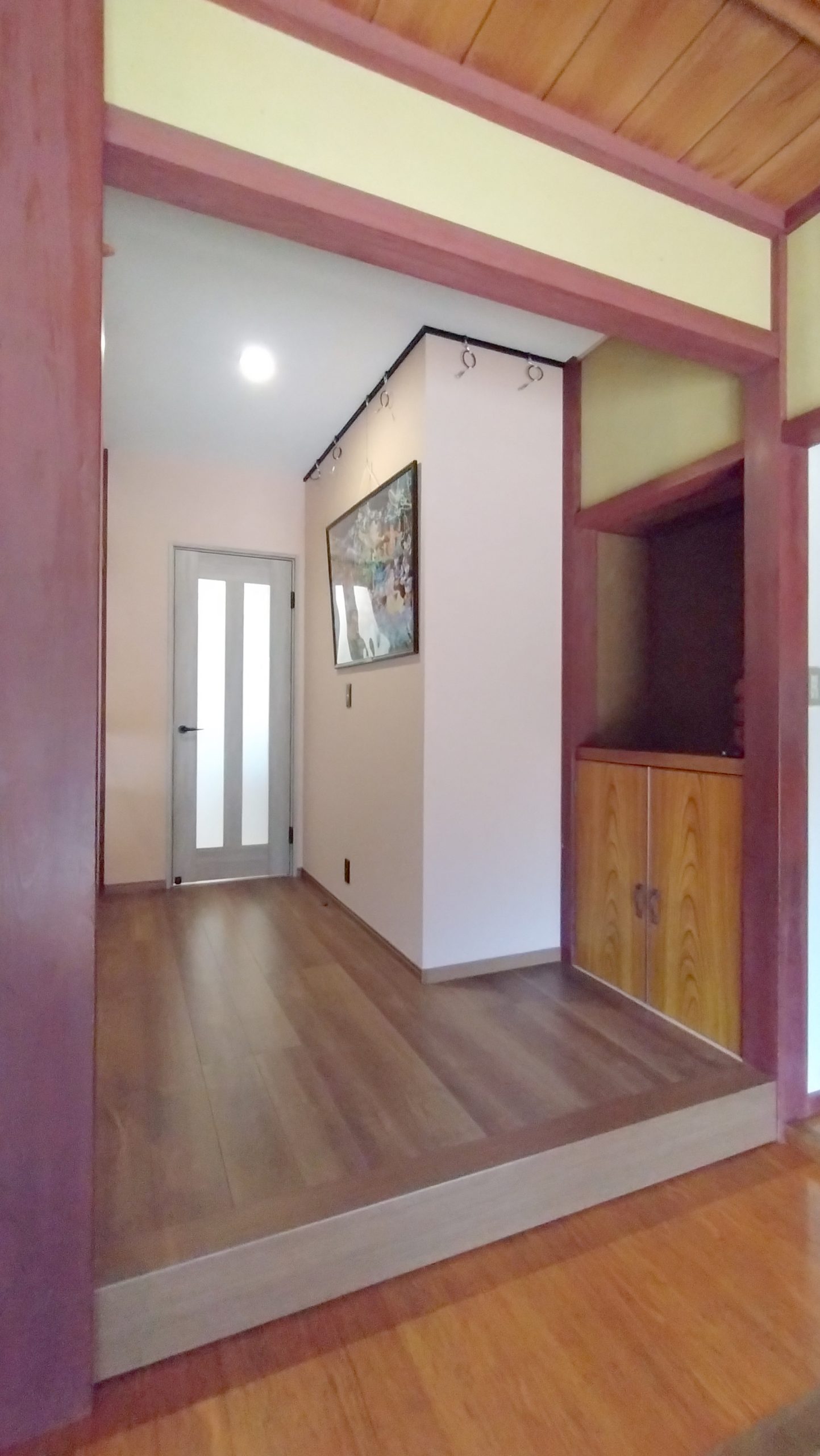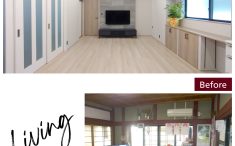 日本の伝統建築『田の字の家』の北側和室2間とダイニングキッチンを、寝室と対面キッチンのLDKに改修しました。すべてフローリングでバリアフリー化。キッチンから洗濯脱衣室への家事動線に配慮したプランにしました。断熱材とLowE複層ガラスサッシで断熱性能向上。壁掛けテレビ面にはエコカラットタイルを設えました。天井からの間接照明でエコカラットが柔らかい光で照らされます。がLDKを彩るよう計画しました。