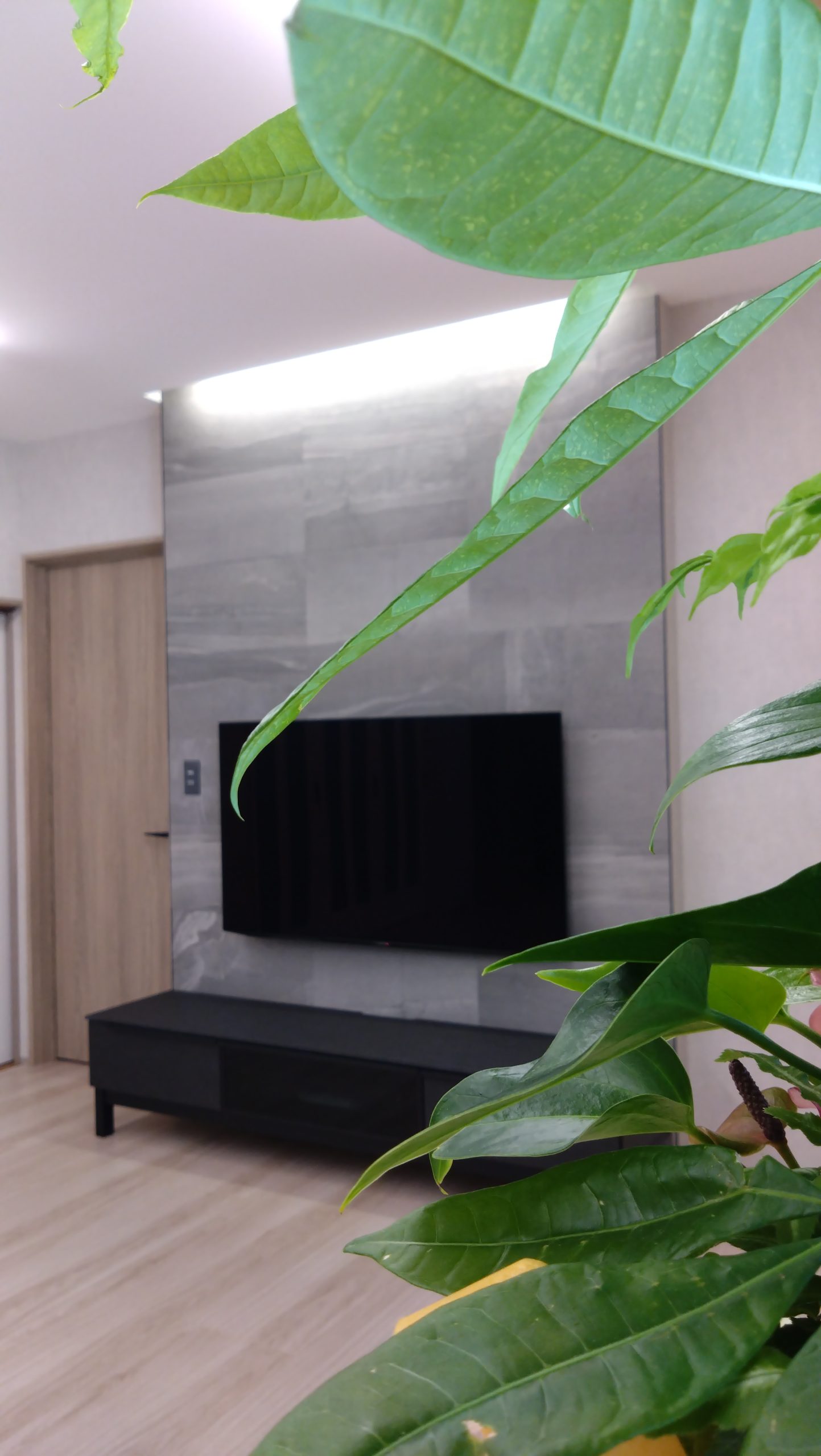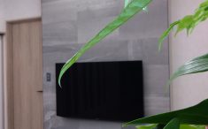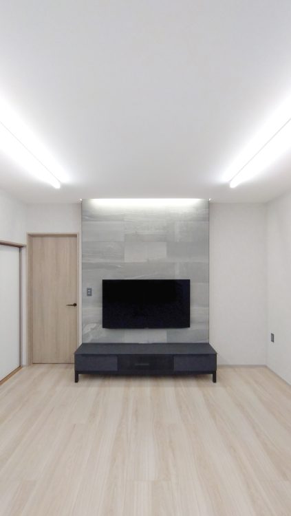 - 壁掛けテレビ面にはエコカラットタイルを設えました。天井からの間接照明でエコカラットが柔らかい光で照らされます。また、リビングダイニングに2列のライン照明を配することで、スタイリッシュな空間になりました。リビングダイニングの傍らには、造り付けのカウンター収納を造作しました。リビングの小物がスッキリ片付きます。