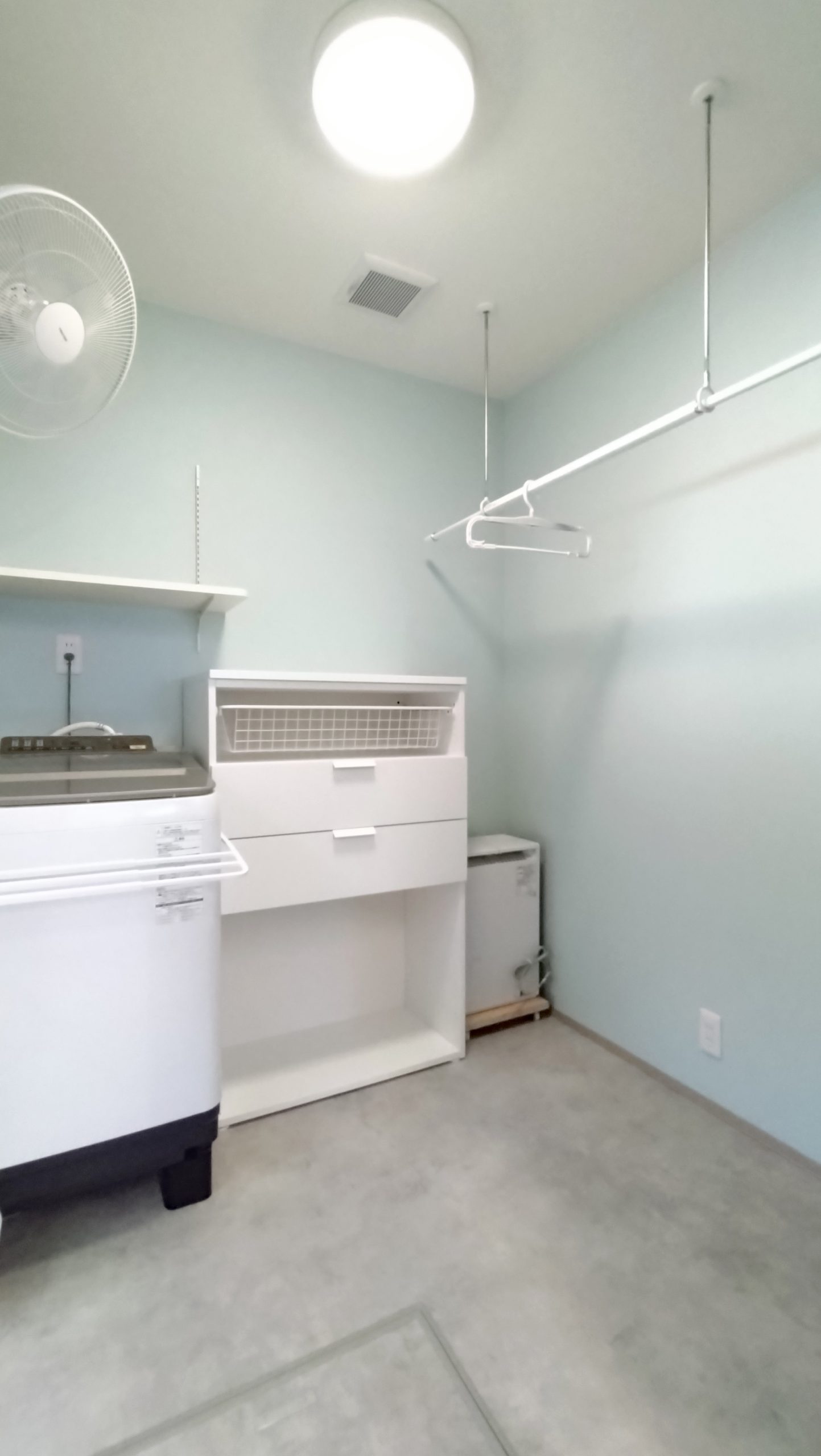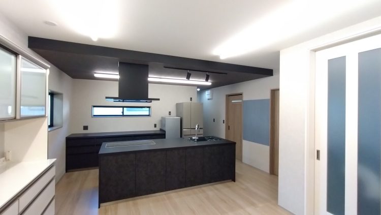 キッチンはパナソニックキッチンLクラス・ヴィンテージメタル柄。アイランドキッチンでフラットなカウンターにすることで、スッキリと空間が広く見えます。キッチンの色に合わせて下がり天井の色をコーディネートし、オープンなLDK空間の中でも、キッチンの領域を柔らかく仕切っています。キッチンの傍らには、ブルーグレー色のPanasonicマグネットボードを設置しました。市販のマグネットフックを取り付けたり、写真を飾ったりすることができます。キッチンから洗濯脱衣室へ直接行けるようにして、家事動線に配慮したプランにしました。