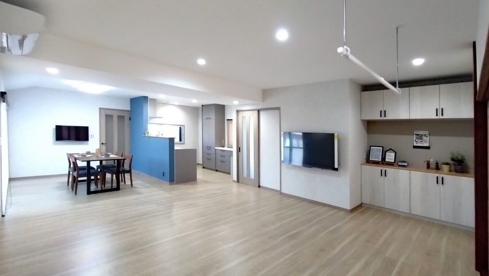 - キッチンやダイニングにいる家族と目を合わせやすい配置のLDKプランになりました。小物が片付くシステム収納『Panasonic多用途収納』を採用しました。リビングのスッキリキレイが続きます。また、多用途収納の壁面には『Panasonicベリティスウォールマグネット』を施工。