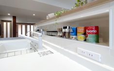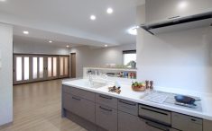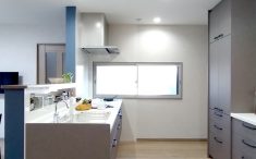 薄いグレー色のパナソニックキッチンを採用。 また、対面キッチンのカウンターは好みの高さで造作し、キッチン側には 調味料がスッキリ整頓できるスパイスニッチや調理家電が使い やすい位置に薄型コンセントを設けました。リビングダイニングが 見渡せて、家事動線にも配慮したキッチンになりました。