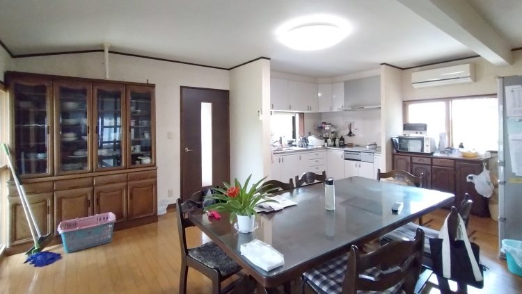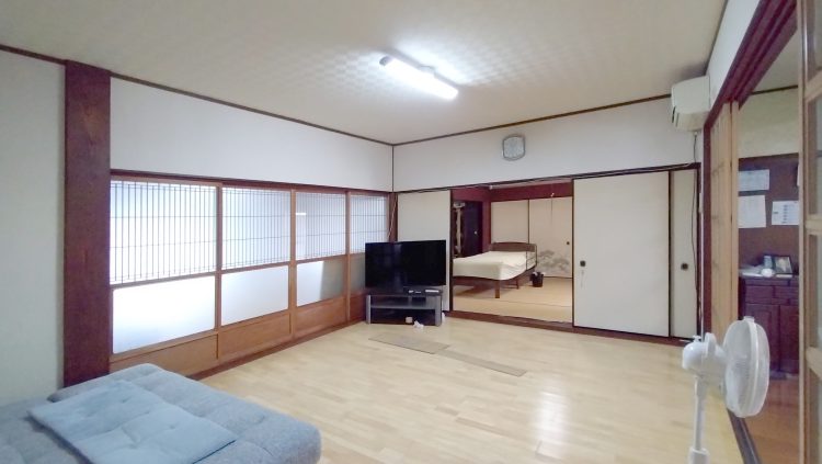 日本の伝統建築『田の字の家』。キッチンを対面化し、大空間のLDKに改修しました。すべてフローリングでバリアフリー化。キッチンから洗濯脱衣室への家事動線に配慮したプランにしました。断熱材とLowE複層ガラスサッシで断熱性能向上。北広縁を部屋に取り込んだ寝室とLDKを隔てる壁は防音シートと簡易遮音ドアの仕様としました。