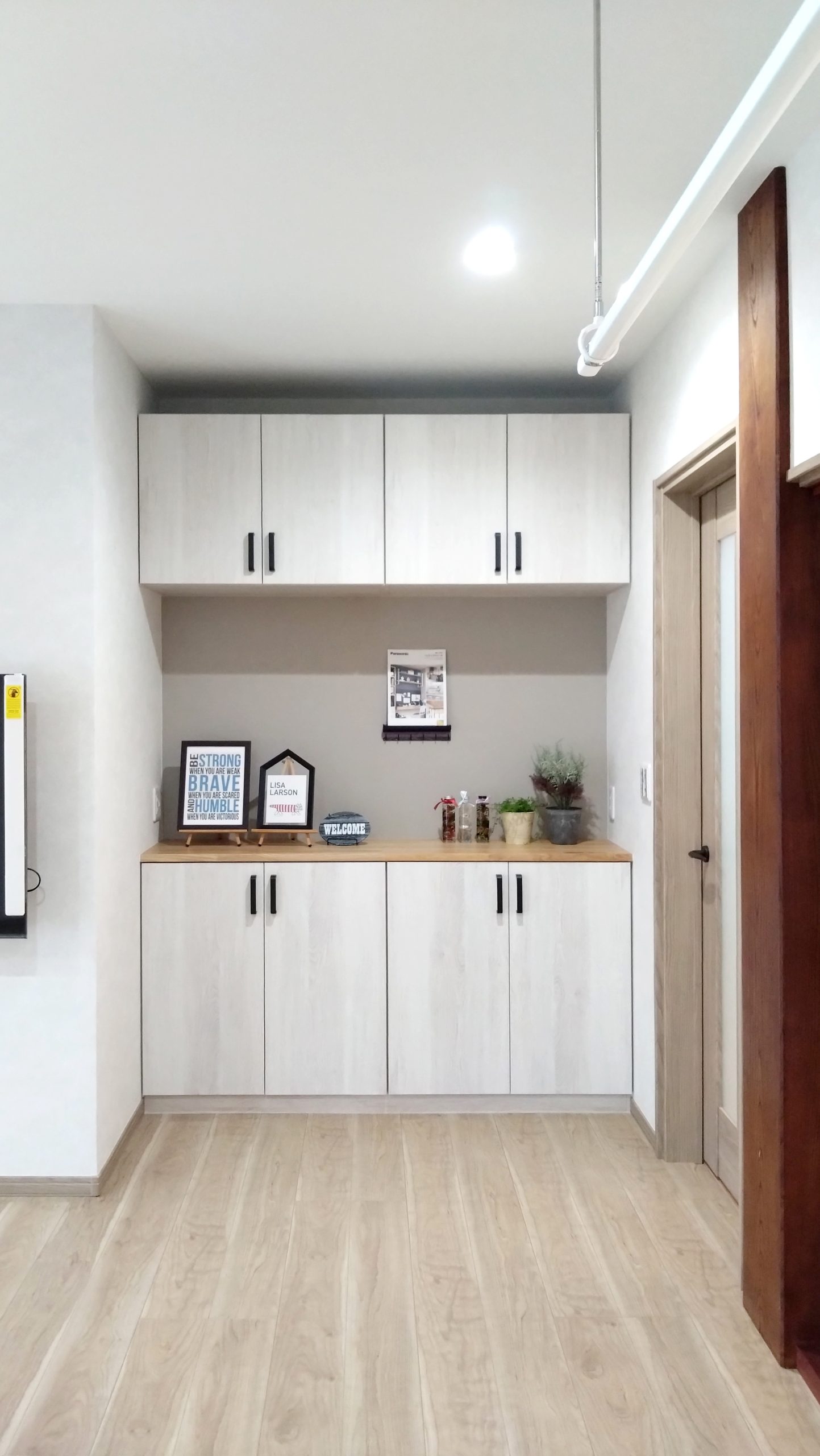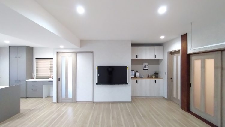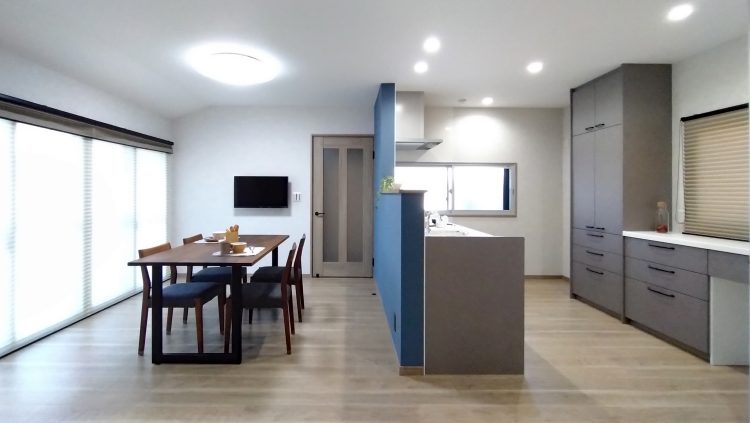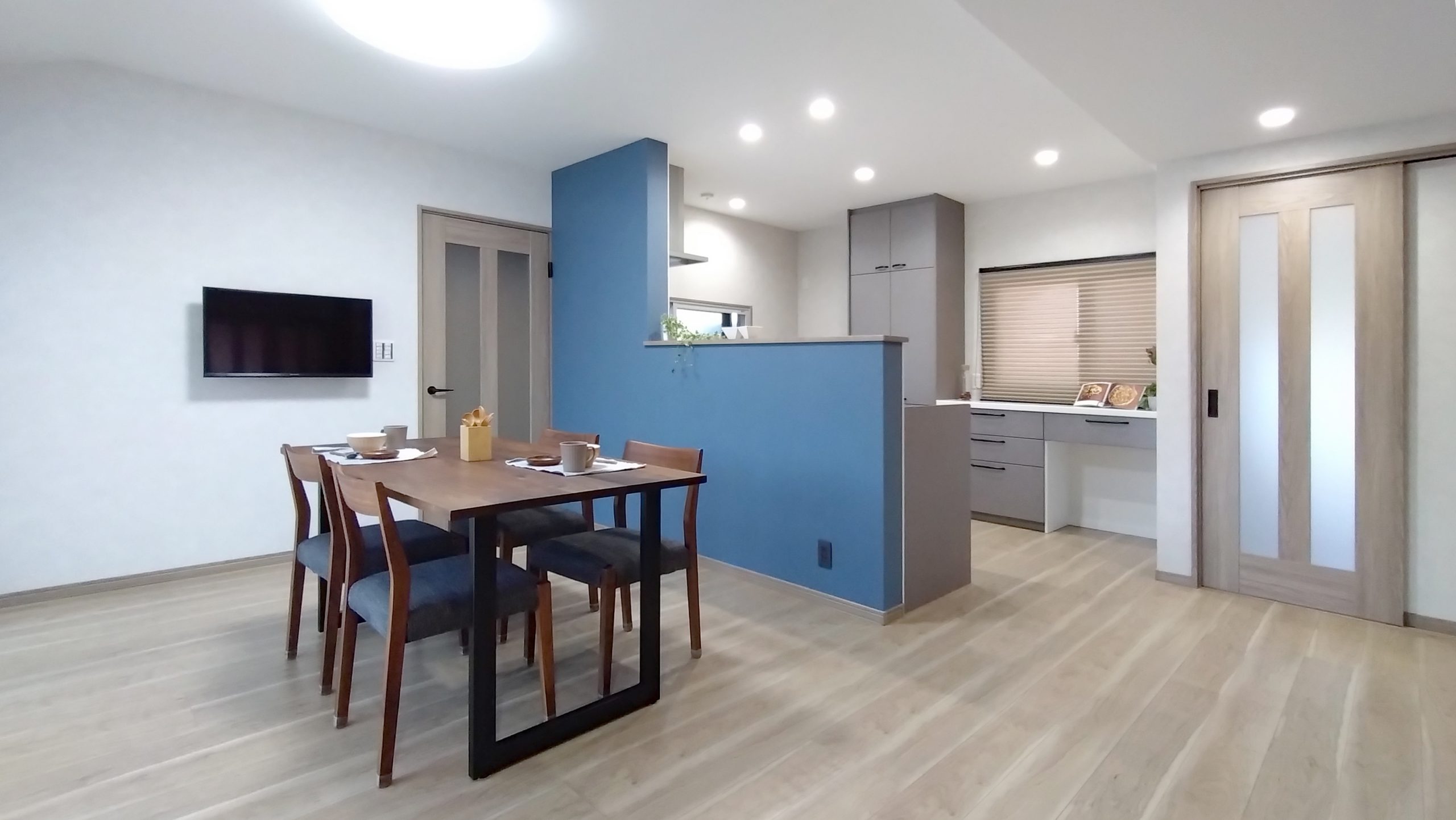 - キッチンやダイニングにいる家族と目を合わせやすい配置のLDKプランになりました。小物が片付くシステム収納『Panasonic多用途収納』を採用しました。リビングのスッキリキレイが続きます。また、多用途収納の壁面には『Panasonicベリティスウォールマグネット』を施工。