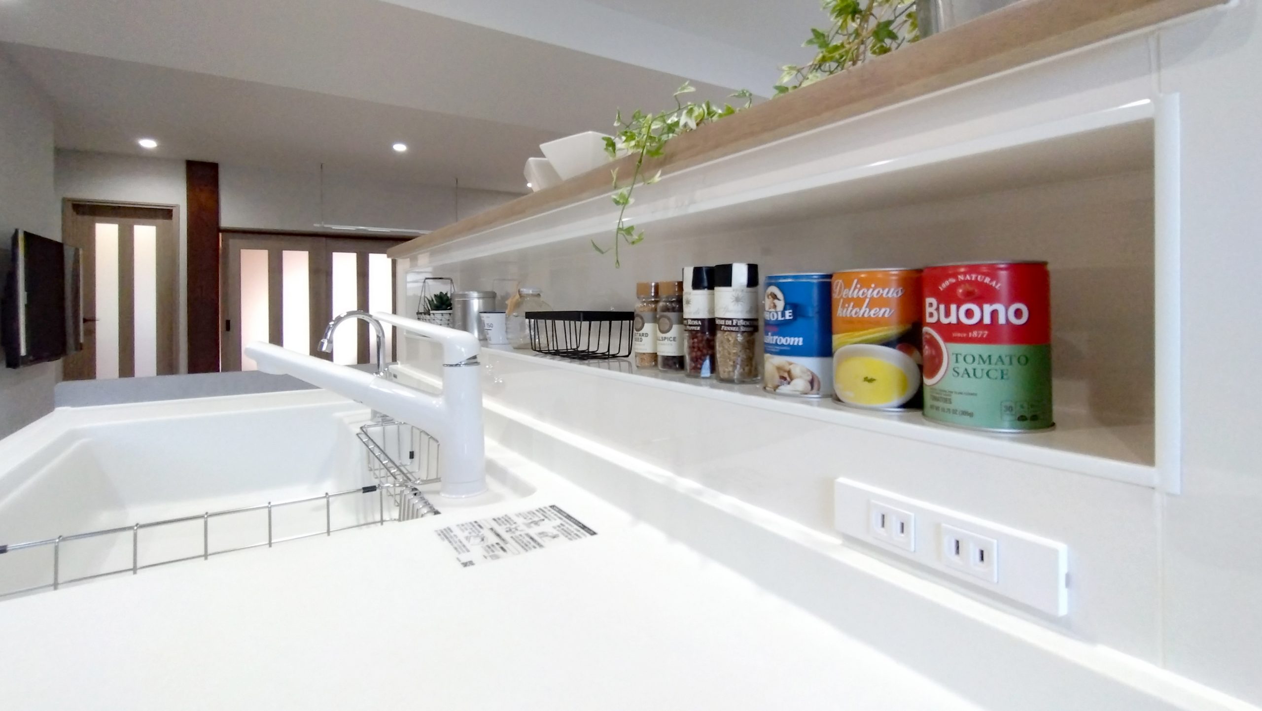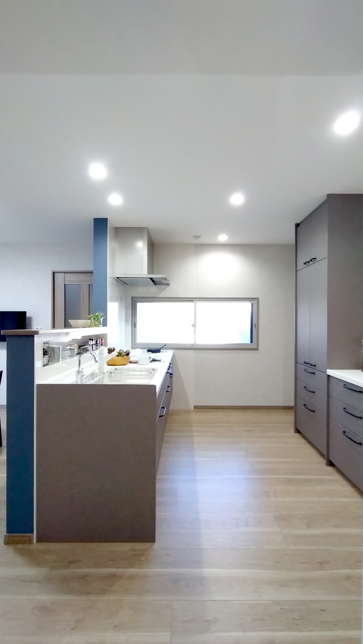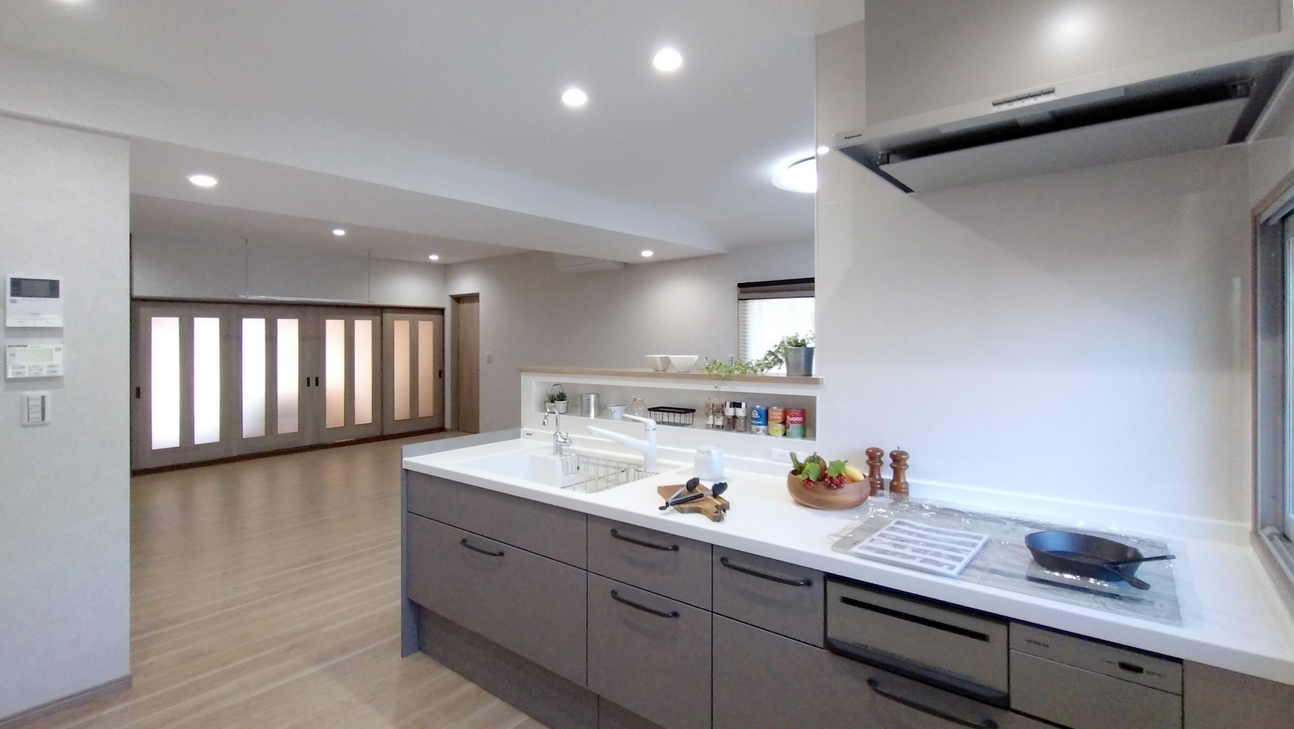 薄いグレー色のパナソニックキッチンを採用。 また、対面キッチンのカウンターは好みの高さで造作し、キッチン側には 調味料がスッキリ整頓できるスパイスニッチや調理家電が使い やすい位置に薄型コンセントを設けました。リビングダイニングが 見渡せて、家事動線にも配慮したキッチンになりました。